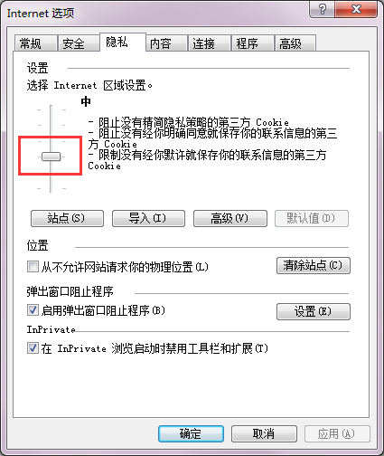 3.将滑块设置到“中”。事实上,中级安全水平允许接受所有合法的cookies数据。它会阻止没有精简隐私策略的第三方Cookie。