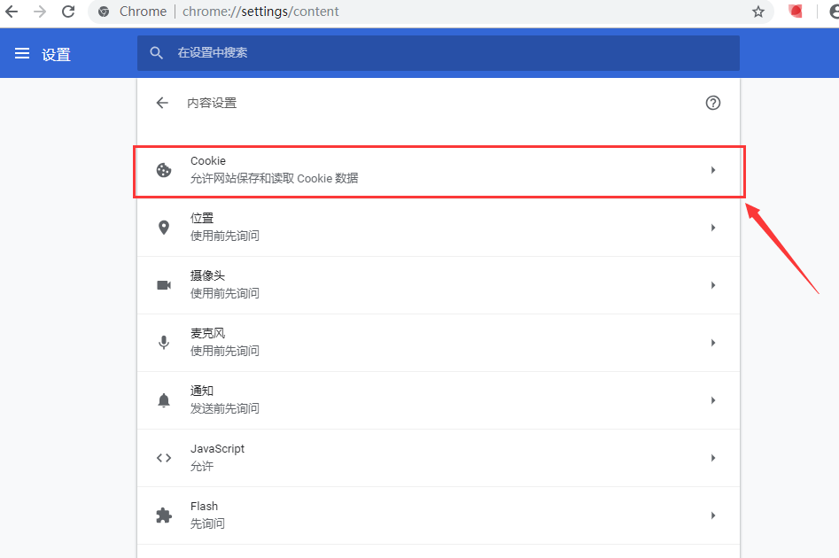 4.选择内容设置中的“Cookie”。