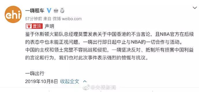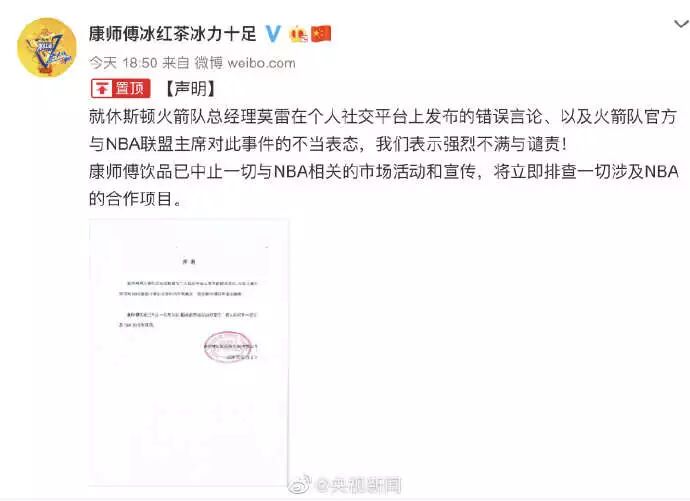 导读:休斯顿火箭队总经理莫雷发表涉港不当言论事件继续发酵,央视再次发声暂停NBA赛事转播安排、腾讯体育暂停转播NBA季前赛,中国企业全面暂停与与NBA合作。