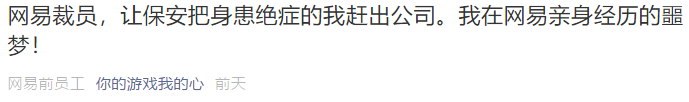稍早前,一篇名为《网易裁员,让保安把身患绝症的我赶出公司,我在网易亲身经历的噩梦》的文章在朋友圈刷屏。
