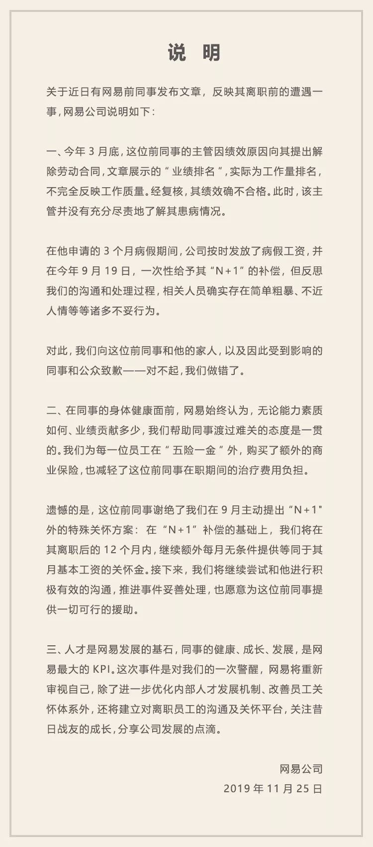 在说明中,网易称:“但反思我们的沟通和处理过程,相关人员确实存在简单粗暴、不近人情等等诸多不妥行为。对此,我们向这位前同事和他的家人,以及因此受到影响的同事和公众致歉——对不起,我们做错了。”