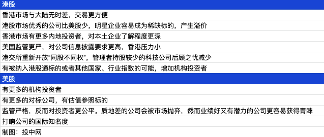 为了扫清市场中存在的障碍,李小加一度推行了三通改革(即“深港通”、“沪港通”以及“债券通”),也于2018年4月公布了新的《上市规则》,首次向采用非传统股权架构的新经济公司和生物科技公司敞开大门。这一度让新经济公司重回港交所怀抱。港交所数据表示,在新《上市规则》实施后,共有28家新经济公司和生物科技公司在香港上市,IPO集资额达到1360亿港元,占全年近一半。对比纽交所,今年3月,纽交所代表Marc Lyeki透露,目前总共有88家中国公司在纽交所上市,总市值达1.4万亿美元。截至今年3月,纽交所上市公司总共有2400多家。来自亚太的上市公司有120多家,中国占其中70%。2018年,纽交所所有的海外IPO公司中,有68%来自中国。那么,对创业公司而言,港交所代表的港股市场和美国纽交所、纳斯达克交易所代表的美股市场哪个更具吸引力?老虎证券团队对投中网表示,公司选择上市地点都是有自己的战略考虑的,并不会盲从,也不会随意改变。每个市场都有自己的优缺点。比如,香港市场的优势主要有六:交易更方便;明星企业更容易成为稀缺标的,产生溢价;香港市场对本土企业了解程度更深;监管压力相对较小;“同股不同权”制度重新开放;有被纳入港股通标的或者其他国家、行业指数的可能,增加机构投资者。而美股上市的优势主要在于有更多的机构投资、有更多的对标公司,监管更严格也更容易打响国际知名度。