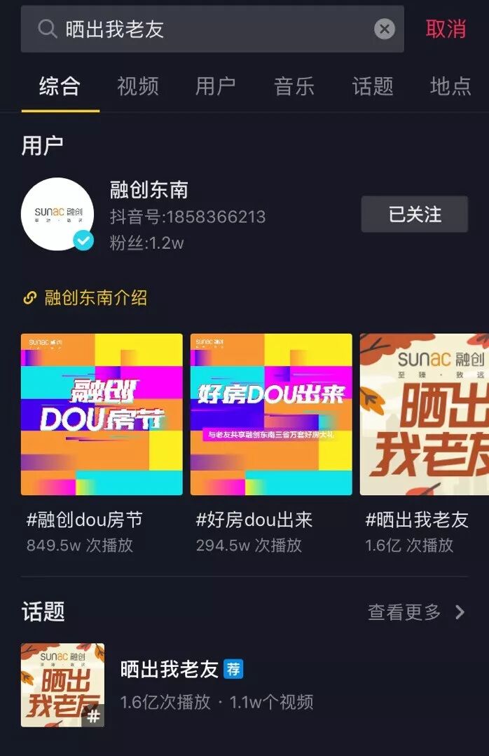入驻抖音后,融创东南重磅推出了两大活动——发起首届融创Dou房节、上线“#晒出我老友”品牌话题挑战赛,深度挖掘短视频领域的社交属性。作为融创东南蓝v品牌馆的首开之作,诚意,是这两大活动的最大看点。首届“融创DOU房节”活动,推出东南三省的万套房源,面向全部抖音用户,给出了实打实的千万购房优惠,同时发起#晒出我老友#抖音挑战赛,这是融创东南对其11月底发起的融创“老友季”活动的线上延展。从12月7日到12月9日,短短三天的时间,话题总曝光量就达到1.3亿,总参与视频量突破1.1W。其中,杭州融创玖樟台项目原创视频以第一人称视角展现都市奋斗青年从租房到买房的心路历程,将美好生活的实现过程浓缩在50秒的视频中,引发了网友关注和共鸣。截止到9日0点,这条视频的浏览量达到825.5W,点赞数1.9W。社交场景加上真挚情感,为原本严肃的地产品牌信息增加了人情味,抖音在社交场景里的作用力和融创东南在垂直领域的经验值实现了融合。