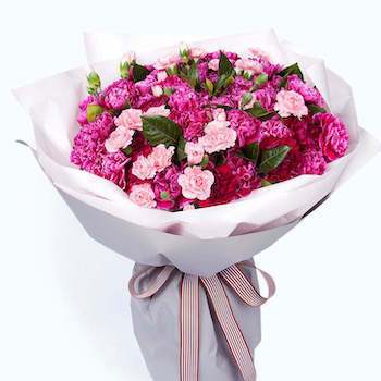 材 料:粉色康乃馨66枝、栀子叶2扎、白色石竹梅0.5扎