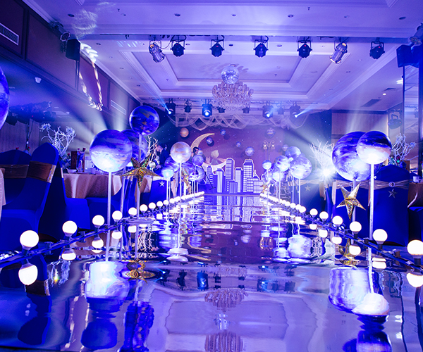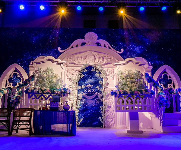 灵感源自南太平洋“阿达拉”人鱼传说,以清新海洋蓝为主色调,定制桁架鱼尾配合欢悦涌动的海豚与海浪,辅以星星点点银色球饰点缀其中,银光微闪,花架灵动,呈现自然舒爽的视觉体验。