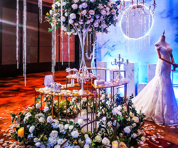 整场婚礼以浅香槟为基调,暖黄色的灯光,朦胧的水雾,烘托出温馨浪漫的唯美场景,干净的大型道具布搭配白色香槟色的花艺,让新人和来宾们都能陶醉在幸福梦幻的氛围中。