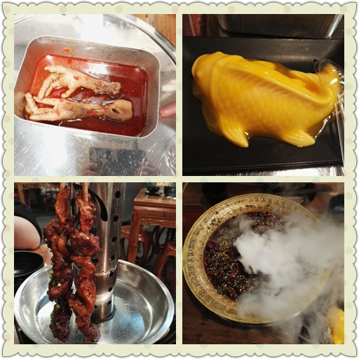 鲤鱼补丁甜软可口,是广受大家喜爱的。鸡爪一点不腻,连我这个平时不吃的也吃了两口。烤串是肉和菠萝相间的,菠萝的甜味2中和掉了辣味,很适合不能吃太辣的人。最后的这一大盆颜值很高的鸡肉,口感滑嫩,味道鲜辣真的是一大盆。