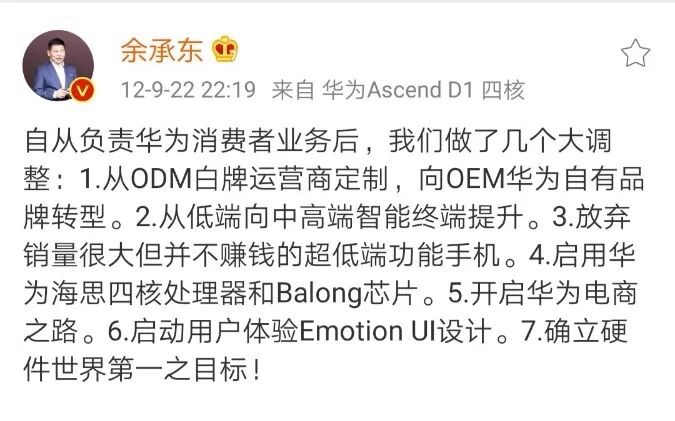 摆脱白牌机、品牌高端化、自研芯片地位提升、做电商、做有体验的系统、确立硬件第一目标,从现在来看,当时这几大目标既有华为转型发展需求的紧迫性,又有立足于长远的大野心。